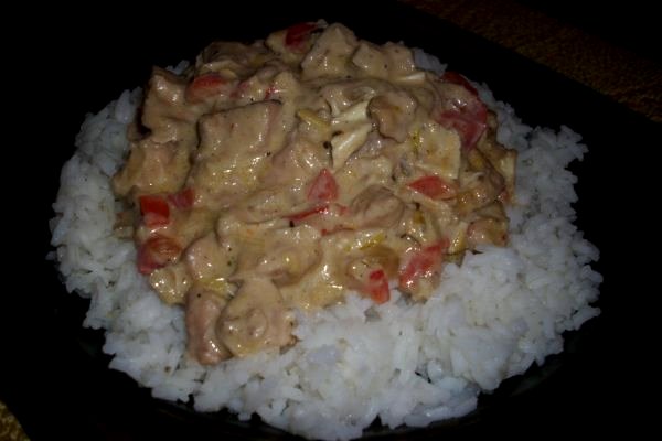 Mięso oprószamy solą i pieprzem. Cebulę, pora, paprykę kroimy w kostkę. Na rozgrzany olej wrzucamy mięso i smażymy. Dorzucamy cebulę, pora oraz liście laurowe - smażymy 5 minut. Zalewamy winem i dusimy bez przykrycia ok 10 minut, po czym dorzucamy paprykę. Po kolejnych 10 minutach dodajemy śmietanę i ser (najlepiej pokroić w drobne kawałki lub rozkruszyć). Mieszamy i dusimy wszystko razem jeszcze chwilkę, doprawiamy do smaku i podajemy z ryżem :)