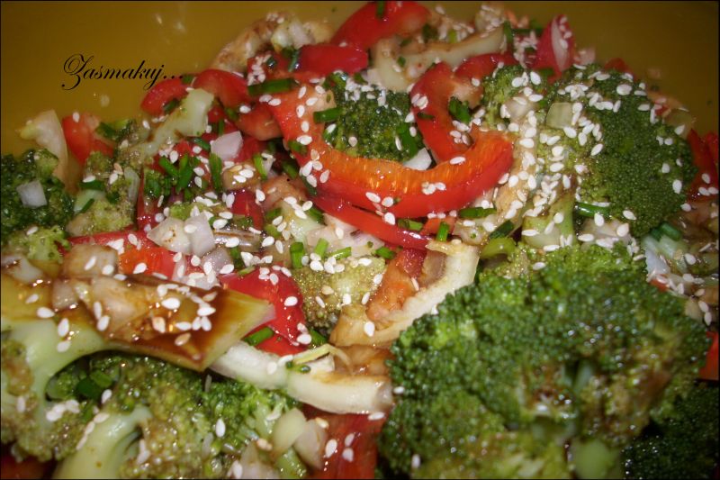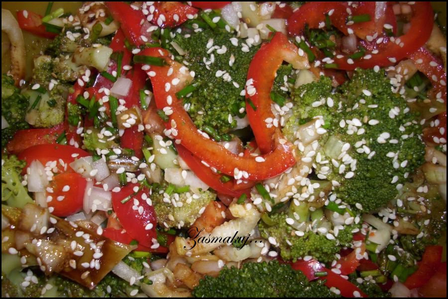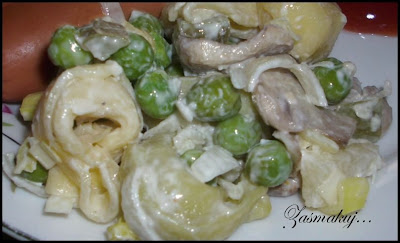 No ale koniec tej dygresji, czas na przepis, a przepis będzie nowatorski (nie znalazłam przepisu na tę pyszną sałatkę w Internecie). Otrzymałam go od cioci, która z kolei od swojej swatowej, która z kolei... to w przepisach tradycyjnych (nieinternetowych) jest fajne, że krążą z rąk do rąk :-) Sałatka jest lekko czosnkowa, ciekawa w smaku, bardzo szybka, prosta i co najważniejsze PYSZNA!